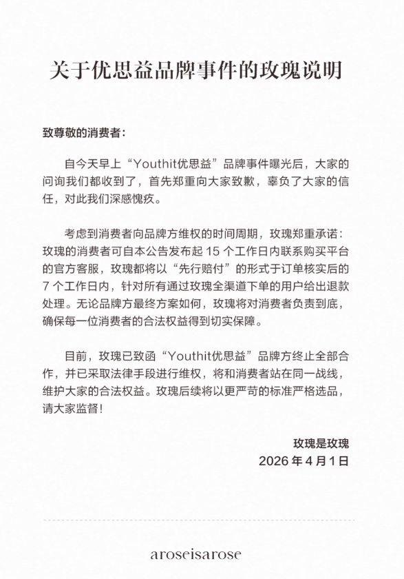 章小蕙当晚也通过其公司账号“玫瑰是玫瑰”发布说明称,郑重向大家致歉,辜负了大家的信任。消费者可自本公告发布起15个工作日内联系购买平台的官方客服,玫瑰都将以“先行赔付”的形式于订单核实后的7个工作日内,针对所有通过玫瑰全渠道下单的用户给出退款处理。