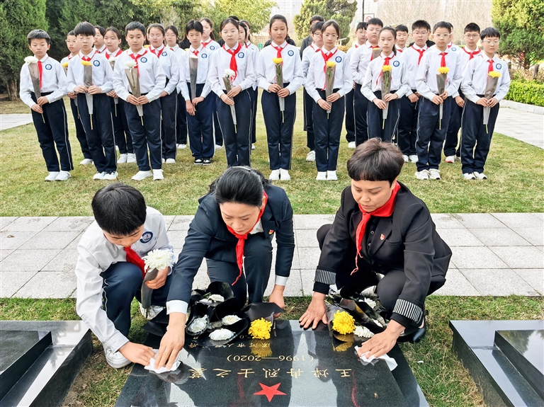 漯河市郾城区东街小学师生到漯河市烈士陵园为王焯冉烈士扫墓。王士刚 摄