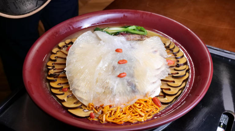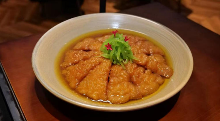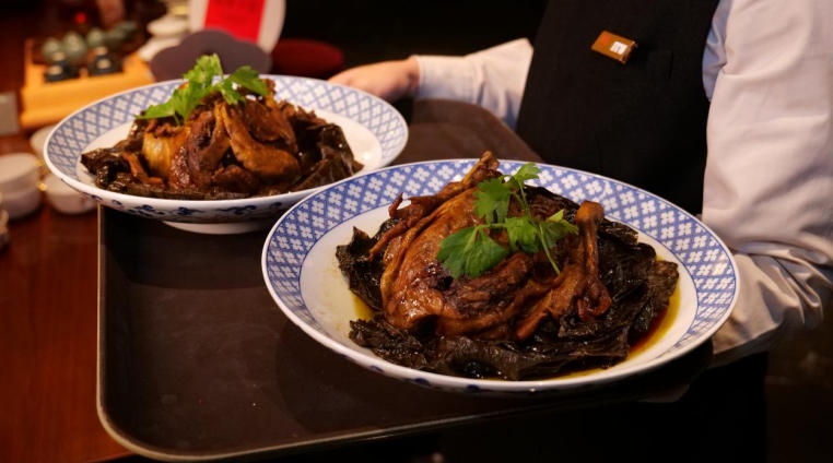 鹏程饭店,江苏省烹饪名师黄铭晨带来了两道名菜,油泡东乡肉皮、鱼翅松茸老鸭,尽显江南家常菜的温润细腻和工艺与风味。