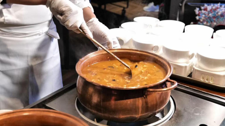 森林大酒店,江苏省烹饪名师蔡晓峰带来了常熟一品锅和瑶柱鲍鱼稀露笋,鲜香浓郁、层次丰富,是江南宴席压轴硬菜。