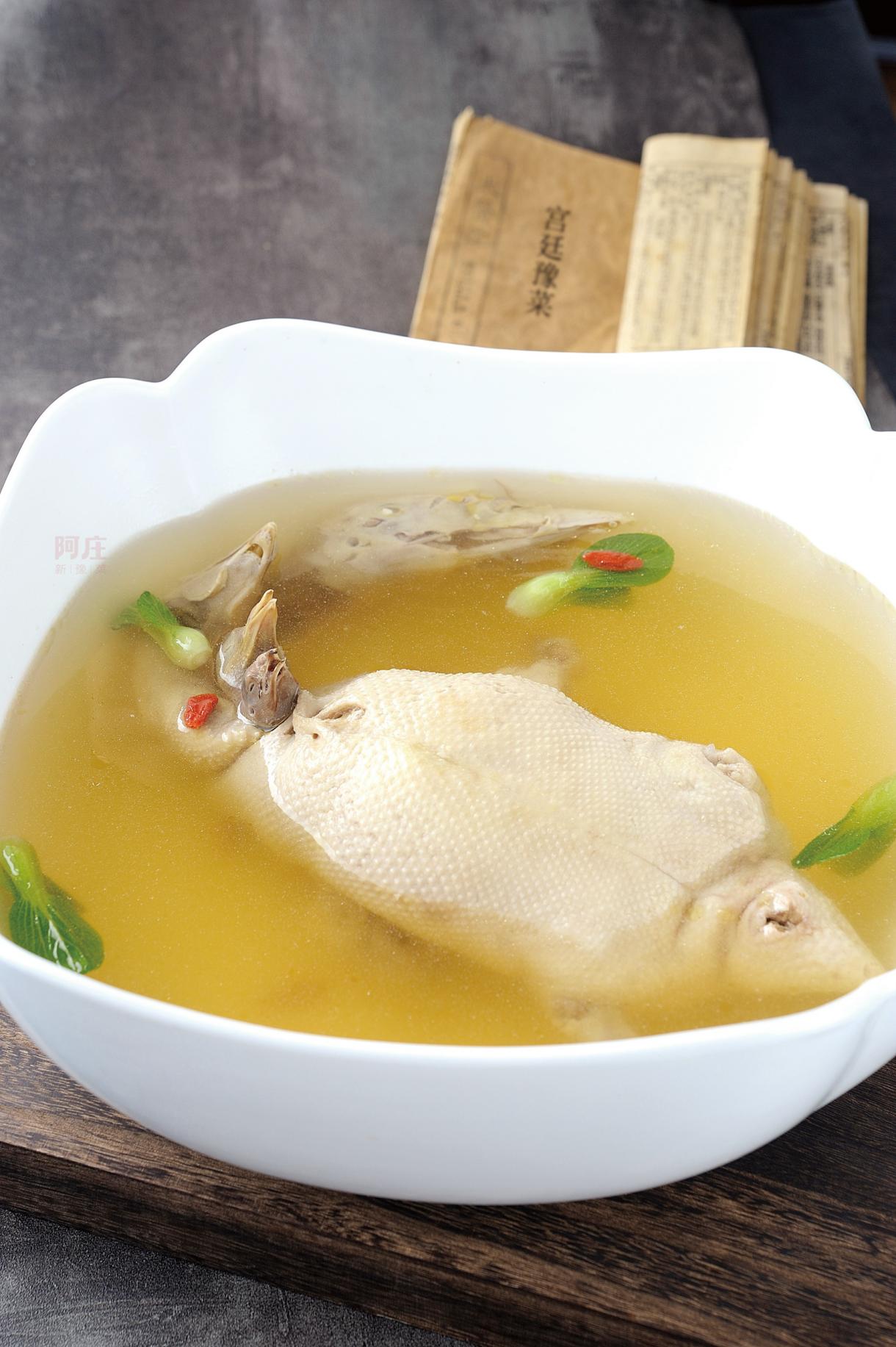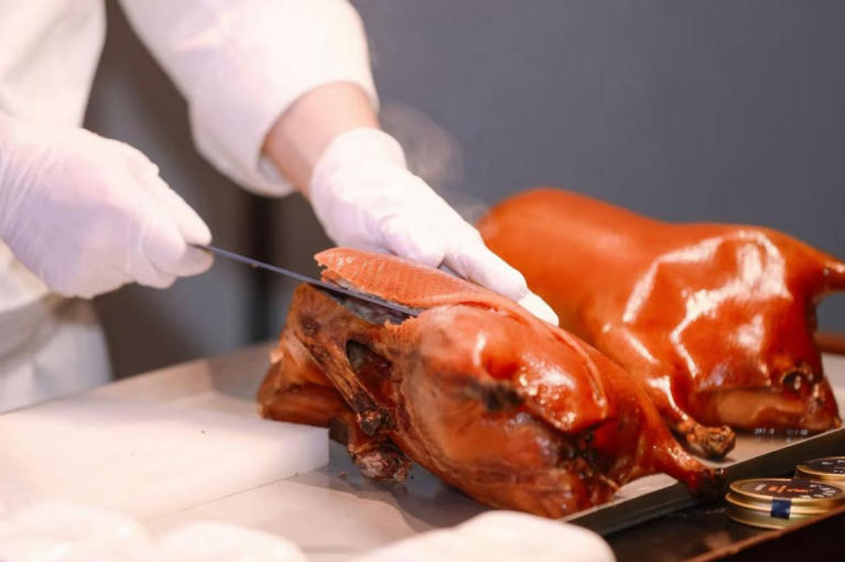 阿庄酥香嫩烤鸭是在继承了北宋汴京传统的烤制技法上,由阿庄研发团队历经四年研制而成,用新郑枣木,挂炉烤制65分钟,保证每一只鸭都是现烤现片,皮酥脆、肉香嫩,枣香味浓。