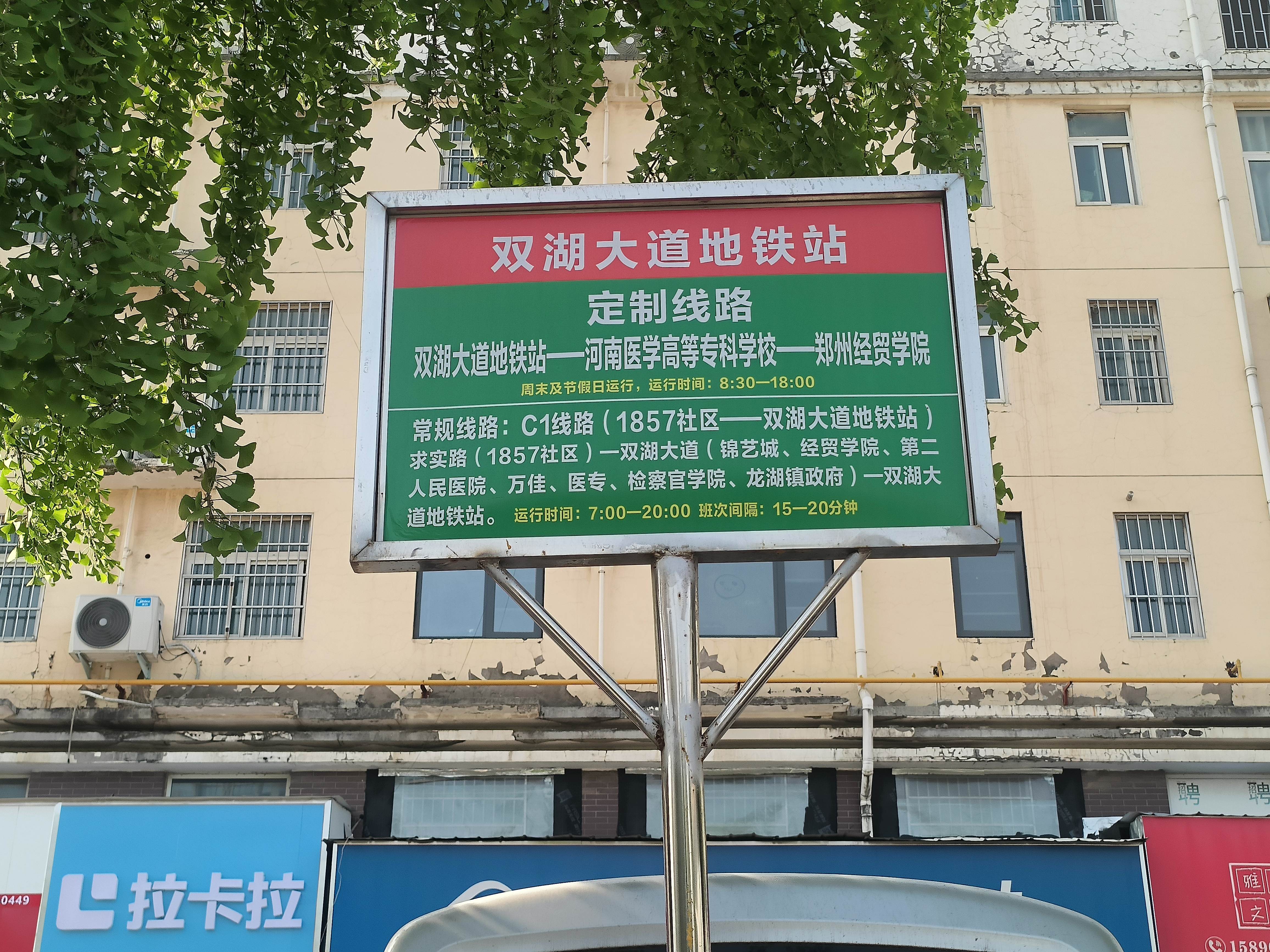 在等待期间,邻妹妹注意到,路边台阶上竖着一块“双湖大道地铁站定制公交候车牌”,上面注明路线为“双湖大道地铁站-河南医学高等专科学校-郑州经贸学院”……
