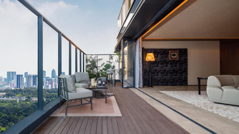 四代宅作为居住形态的迭代升级,核心在于“空中庭院 + 高得房率”的双重突破。中原颂開元的四代宅每户配置私人空中庭院,可种植高大乔木、花草绿植,实现“楼上有院、户户通透”的居住梦想。这种垂直森林式的建筑设计,让家成为私人森林氧吧,告别传统高层“仰望绿化”的遗憾,同时,私家花园和公共平台不计容的特性,使得项目高得房率比传统高层更高,最高综合得房率高达142%,让改善群体获得更高的空间利用率和性价比。