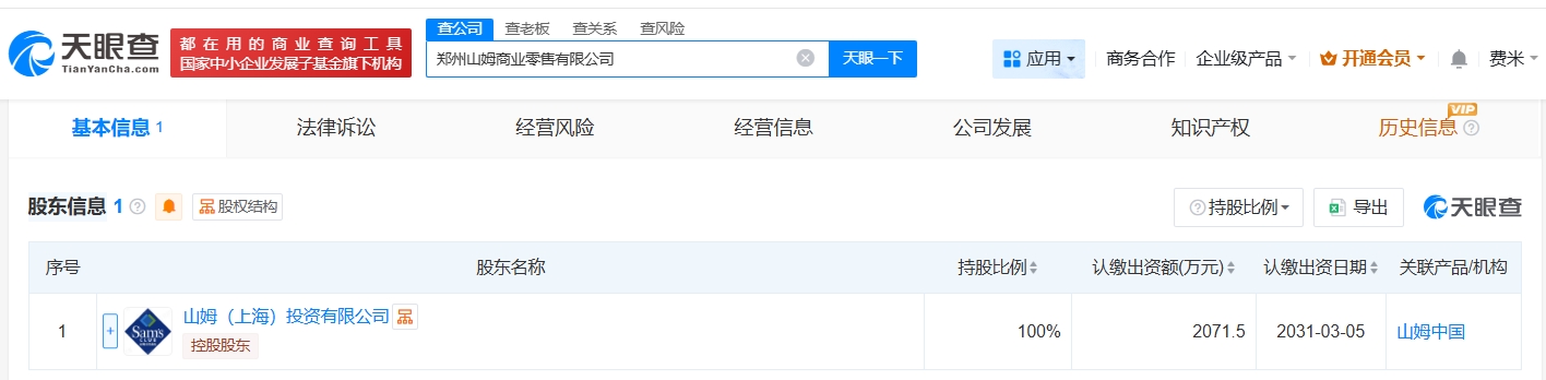 【大河财立方消息】 天眼查App显示,近日,郑州山姆商业零售有限公司成立,法定代表人为郑硕怀,注册资本2071.5万人民币,经营范围包括食品销售、食品互联网销售、日用百货销售等,由山姆(上海)投资有限公司全资持股。