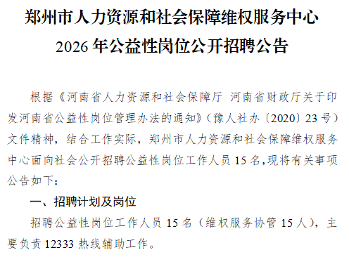 4月10日,记者从郑州市人社局获悉,2026年市本级城镇公益性岗位公开招聘正在进行。市人力资源和社会保障维权服务中心、市劳动人事争议仲裁院、市劳动能力鉴定服务中心等17家单位,招聘负责12333热线辅助、庭审辅助、业务受理等工作内容的人员。