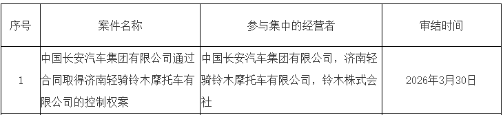 【大河财立方消息】 4月13日,市场监管总局公布无条件批准经营者集中案件列表,其中包括中国长安汽车集团有限公司通过合同取得济南轻骑铃木摩托车有限公司的控制权案。