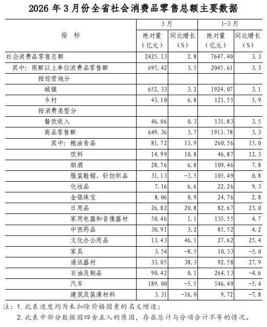 1-3月份,全省社会消费品零售总额7647.40亿元,同比增长3.3%,高于全国0.9个百分点。其中,限额以上单位消费品零售额2045.61亿元,增长3.3%。