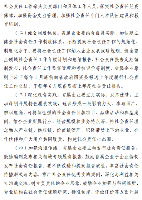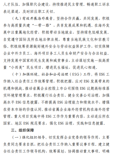 《指导意见》提出,到2026年底,省属企业涌现一批优秀履责典范,集团层面发布社会责任报告实现“全覆盖”,控股上市公司(含新增)披露ESG信息实现“应披尽披”。
