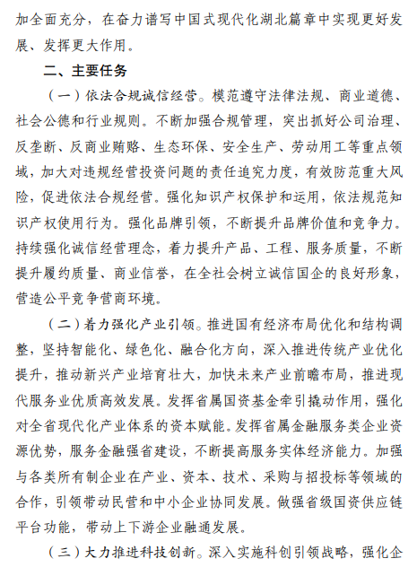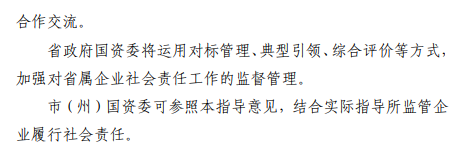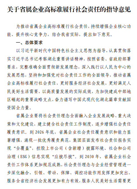 【大河财立方消息】近日,湖北省国资委印发《关于省属企业高标准履行社会责任的指导意见》(以下简称《指导意见》),对省属企业社会责任工作作出部署。