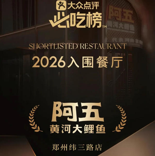 2026年4月22日,大众点评必吃榜入围榜单揭晓,阿五黄河大鲤鱼再度入围。七年的认可,是顾客舌尖的偏爱,更是阿五坚守初心、守正创新的最好见证。