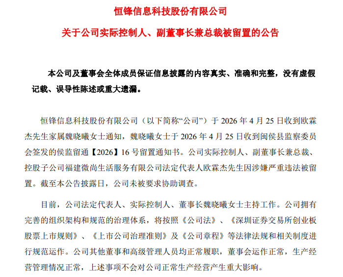 【大河财立方消息】4月26日,恒锋信息科技股份有限公司(证券简称:恒锋信息)公告,收到欧霖杰家属魏晓曦通知,公司实际控制人、副董事长兼总裁、控股子公司福建微尚生活服务有限公司法定代表人欧霖杰因涉嫌严重违法被留置。截至公告披露日,公司未被要求协助调查。