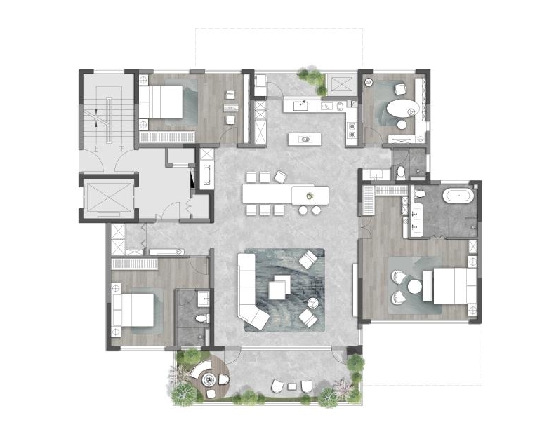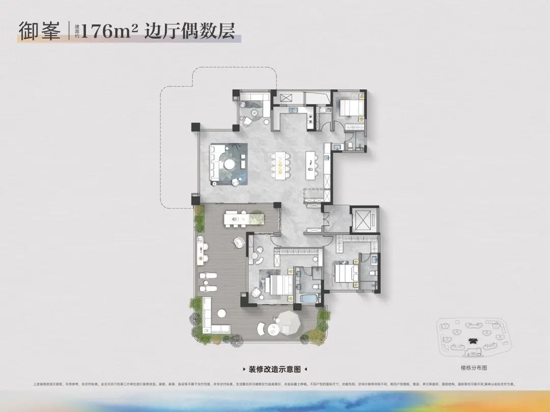 其中建面约176㎡大平层,作为项目顶序改善作品,专为城市高阶改善人群量身打造,依托超四代超前产品逻辑,构筑尺度越级的云端生活场,巨幅全景环幕立面搭配通透通透格局,最大化引光入宅、拥揽城市景致。仅厨房+客厅+露台的面积已经达到惊人地162㎡,得房率约140%,双套房设计。同时,此户型作为楼王产品,L型展开、面积约80㎡的巨型露台,几乎是目前郑州市场上高层住宅中露台尺度的天花板,能够满足露台烧烤种花看星星的所有幻想。