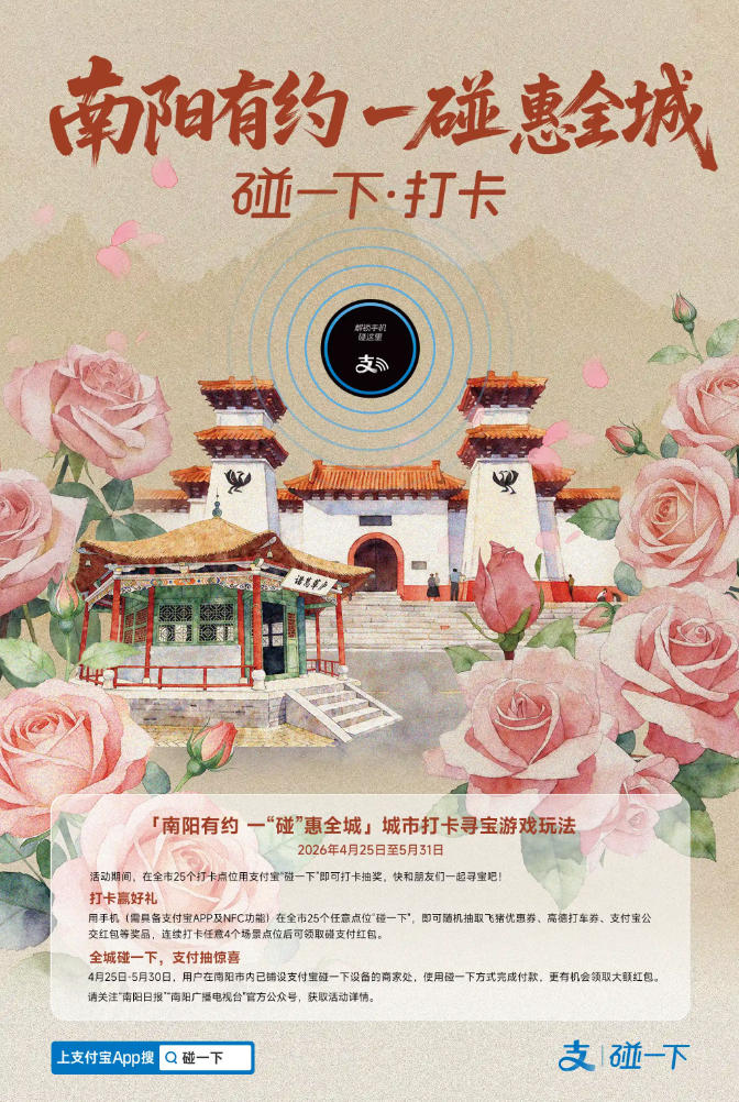 记者从支付宝方面获悉,该平台聚焦游客游玩需求,联合南阳落地全域数字化打卡互动场景,覆盖南阳25个主题打卡点,游客在中国月季园、南阳月季大观园、南阳卧龙岗武侯祠等各大场景中,用手机(需具备支付宝App及NFC功能)在打卡点位“碰一下”,即可领取月季节电子纪念徽章,同时随机抽取奖品,连续打卡任意4个场景点位后可领取红包,最高88元;打卡完成后游客可使用活动首页AI明信片功能,一键生成南阳月季节的专属旅迹照片,实现一键打卡、趣味互动,让赏花游玩更具参与感与仪式感。同时,为进一步串联城市文旅消费脉络,南阳十余条人气街区也落地了“碰一下”。