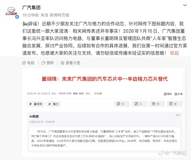 广汽汽车芯片中一半将由格力芯片替代?广汽集团:相