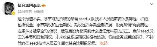 抖音副总裁李亮:字节近期没有招聘到什么近亿元年