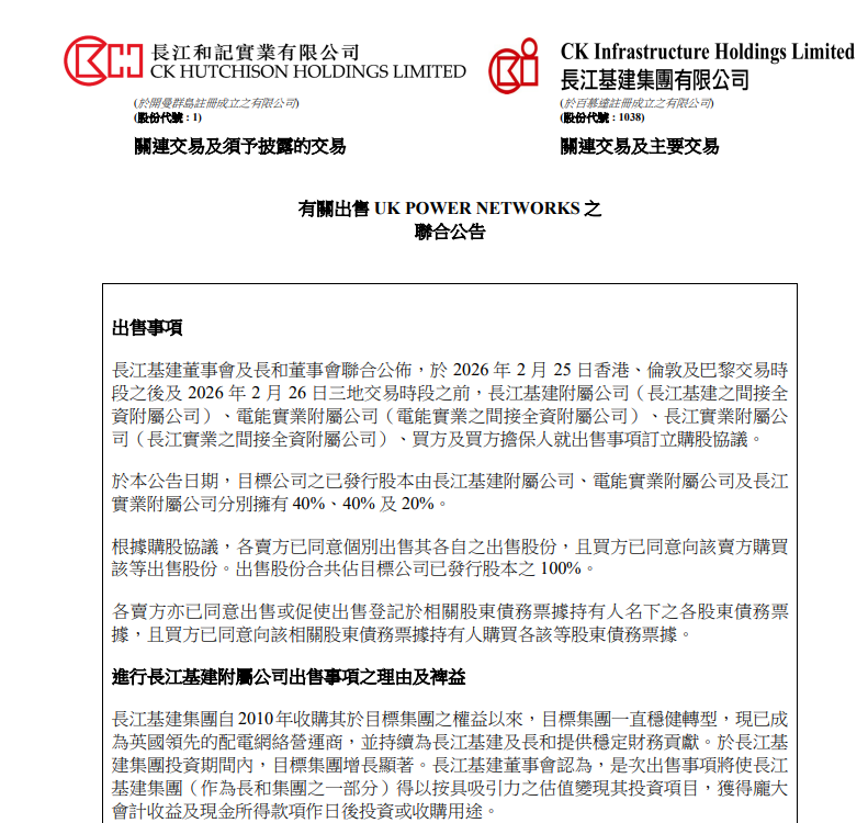 李嘉诚旗下长和系:出售英国电网业务,套现逾1100亿